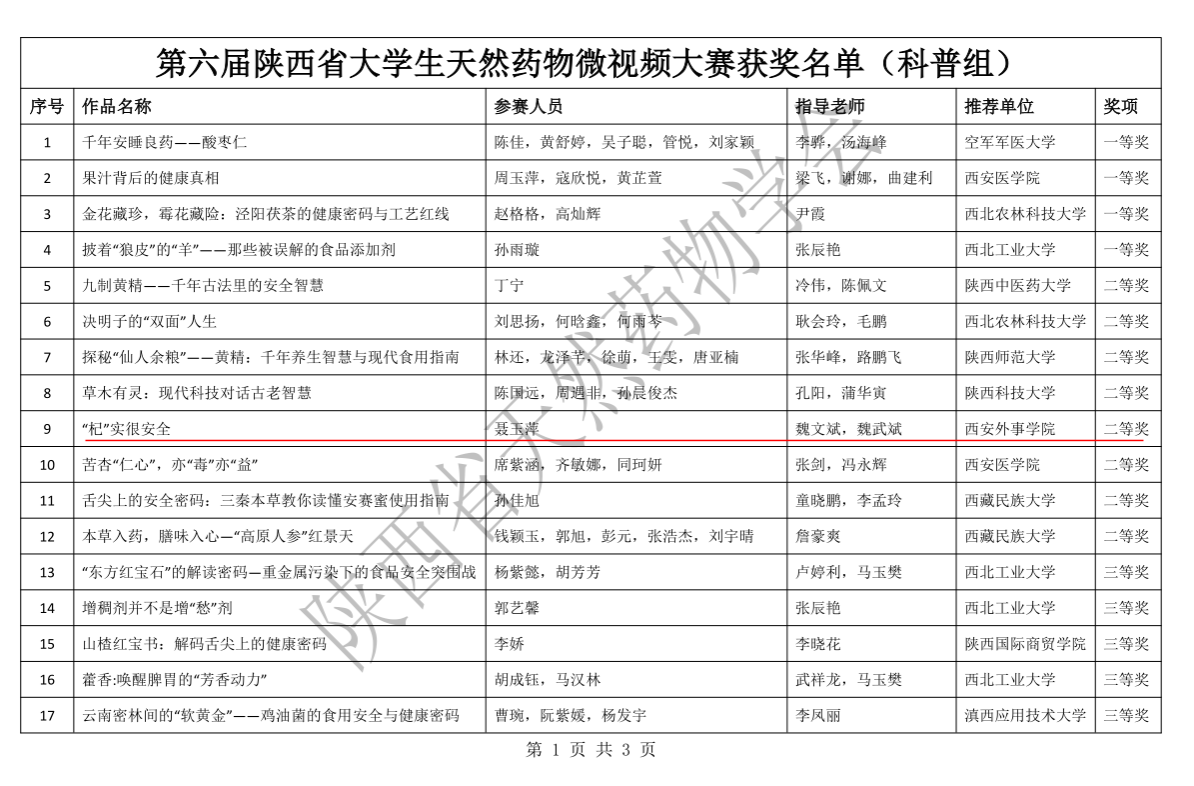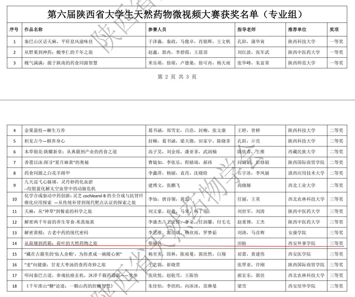 2025年“第六届陕西省大学生天然药物微视频大赛”圆满落幕。本届大赛竞争激烈,大赛组委会共收到来自全省各高校的133件参赛作品,涵盖科普视频与实验技能两大组别。医学院药学系老师积极组织学生精心备赛,共选送9项作品参与角逐,最终凭借扎实的专业功底与出色的创意表现,魏文斌和田盼老师分别成功斩获科普组二等奖1项、专业组三等奖1项。