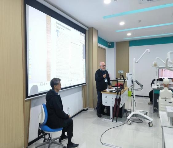 其后的交流环节迅速转向深入而实用的议题。老师们就如何预防因长期操作导致的肩周炎、颈椎病等职业劳损向专家求教,两位专家结合国际经验与临床案例,分享了包括体位调整与工间锻炼在内的系统性防护策略。随后,学生们想了解如何识别与应对治疗过程中患者突发癫痫等医疗紧急状况。Eduardo医生从急诊角度给出了关键性的处置流程指导。此外,双方还就国内外口腔医学教育进行了简单交流,拓宽了师生的国际视野。